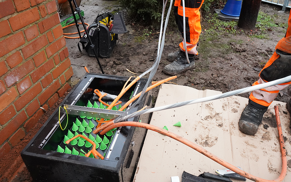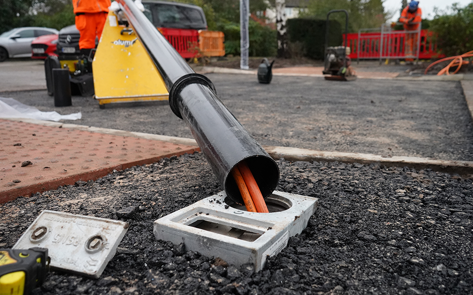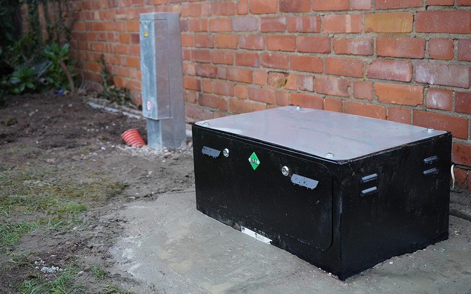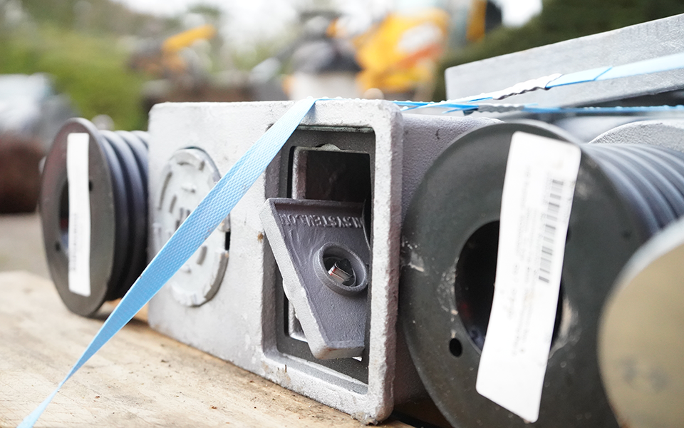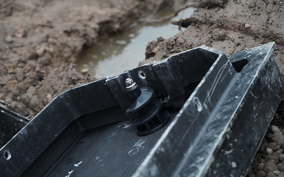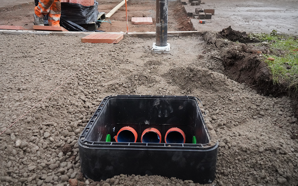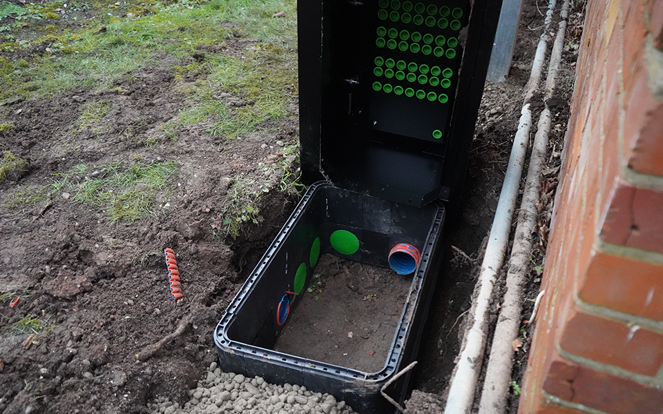 Controller Cabinet Base - an above-ground plinth installed on a STAKKAbox chamber, designed to accept all standard UK and European controller cabinets. The cabinet base is securely connected to the duct network, allowing seamless integration with surrounding STAKKAbox chambers and retention sockets. The plinth provides below-ground access for easier cabling, while the gland tray and castellation bars ensure stable cable management for SWA cables.