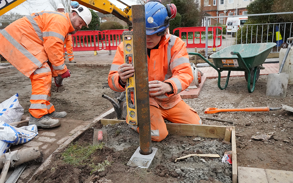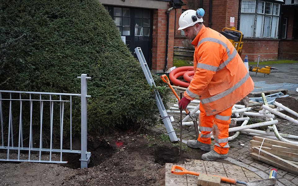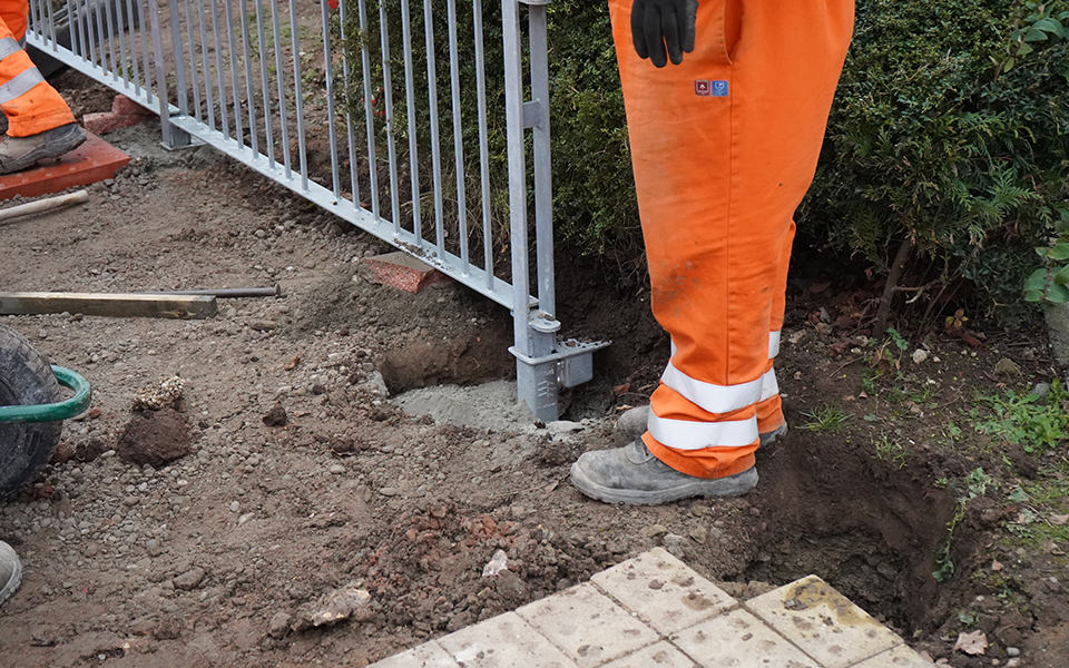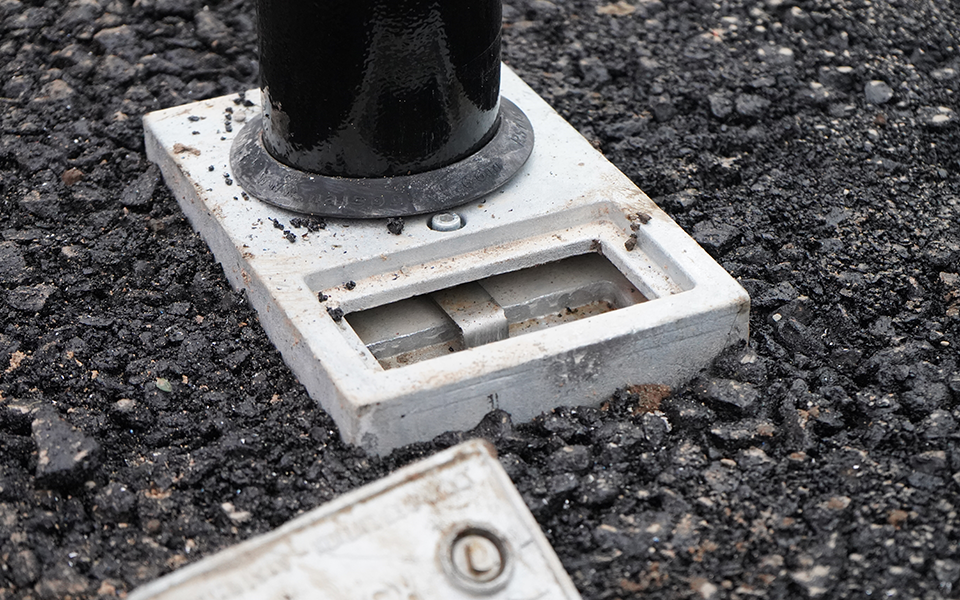 The crossing features several signs: those indicating visitor parking, the school reception, a sign dedicated to the sponsors, and a braille plaque. All have been installed in NAL flat-base retention sockets. Designed for non-illuminated signage that does not require cabling, these sockets provide a robust, reusable foundation for 76mm and 89mm signposts. The sockets securely lock the posts in position, while also allowing easy removal for maintenance or future upgrades to the sign faces.
