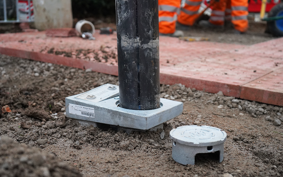 Retention socket - a reusable foundation for illuminated street furniture. The socket is designed to withstand vehicular impacts, ensuring a seamless removal and replacement of damaged poles. The base of the socket features a duct-entry point, designed to accept 150mm ducting, enabling a positive connection to the site's access chamber.